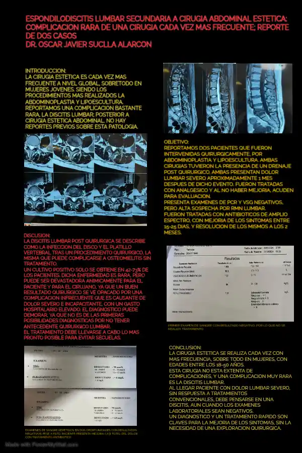 REPORTE DE CASO: ESPONDILODISCITIS LUMBAR SECUNDARIA A CIRUGIA ABDOMINAL ESTETICA: COMPLICACION RAR DE UNA CIRUGIA CADA VEZ MAS FRECUENTE