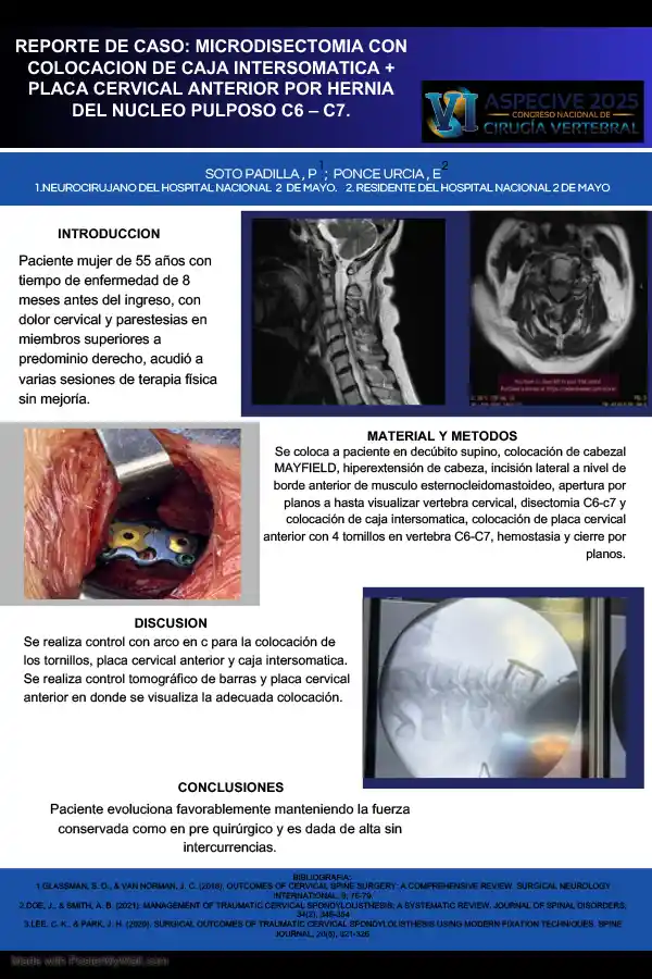 REPORTE DE CASO: MICRODISECTOMIA CON COLOCACION DE CAJA INTERSOMATICA + PLACA CERVICAL ANTERIOR POR HERNIA DEL NUCLEO PULPOSO C6 – C7.